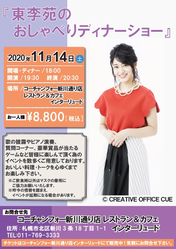 新CM公開を記念して、11/14(土)コーチャンフォー新川通り店にて『東李苑のおしゃべりディナーショー2』を開催いたします。