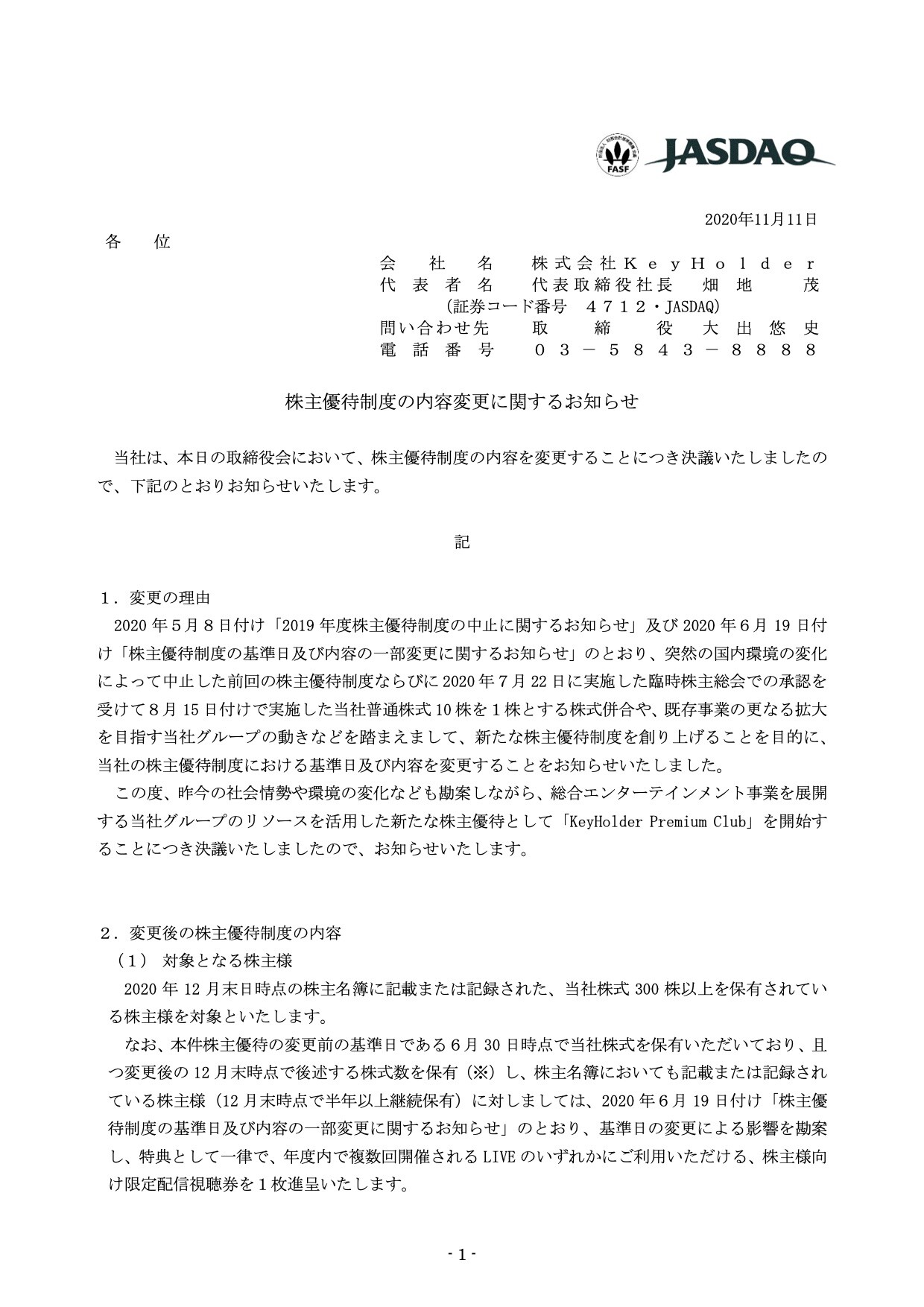 株式会社KeyHolder、株主優待制度の内容変更