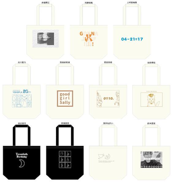 ●生誕記念トートバッグ(2021年1月度)(赤堀君江/荒野姫楓/上村亜柚香/北川愛乃/鈴木愛菜/惣田紗莉渚/菅原茉椰/田辺美月/谷真理佳/西満里奈/深井ねがい)各2,500円(税込)