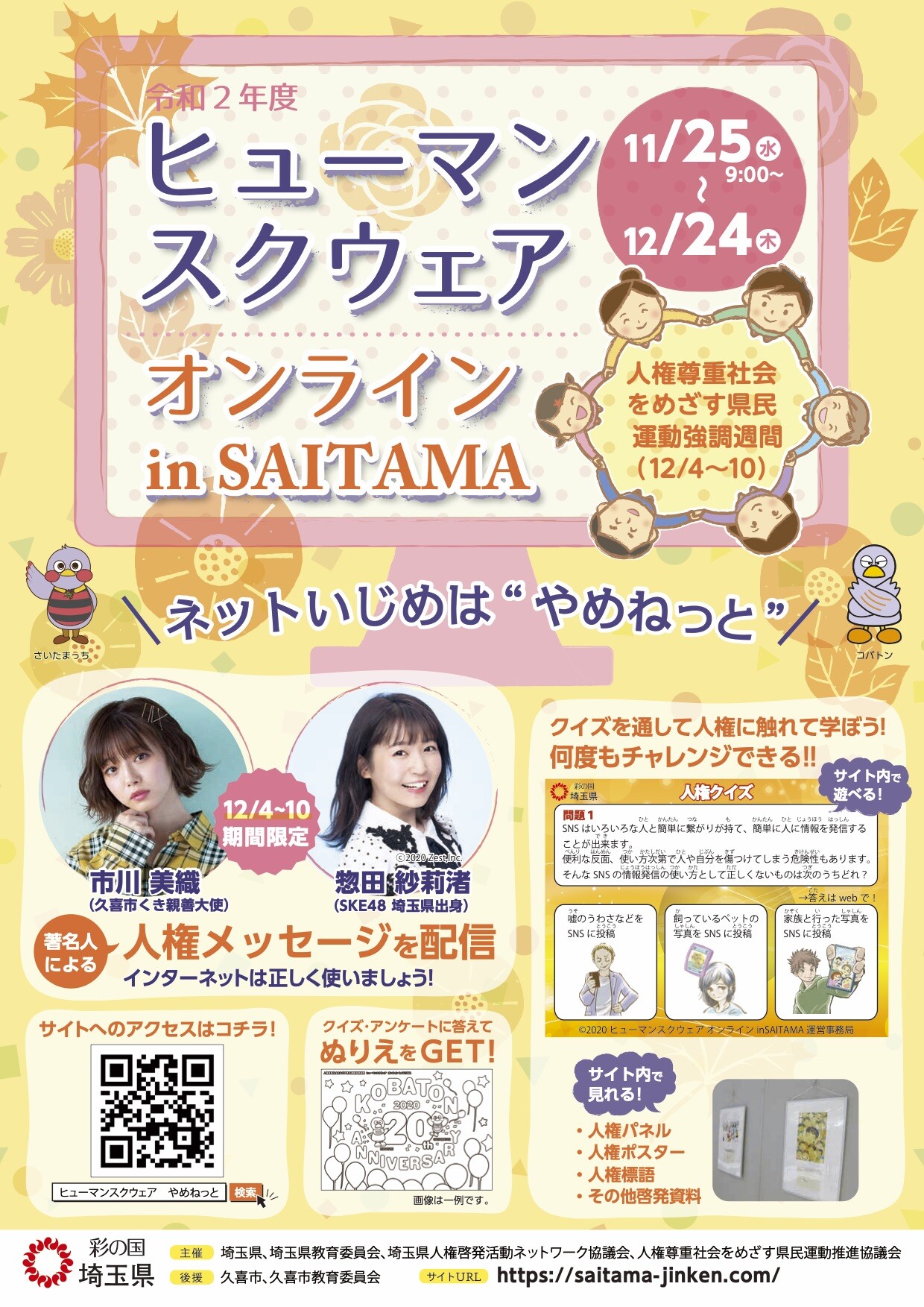 https://www.pref.saitama.lg.jp/a0001/news/page/2020/1125-0201.html埼玉県では、毎年12月4日から10日までを「人権尊重社会をめざす県民運動強調週間」と定めています。そこで、お互いの人権を尊重する意識を高めることを目的として人権啓発イベント「ヒューマンスクウェア」を開催します。今年度は新型コロナウイルス感染症拡大防止の観点から初めてオンラインサイト上で開催します。特設サイトでは、「インターネットを使った誹謗中傷」をテーマに、著名人による人権メッセージ動画や人権に配慮したインターネットの使い方を学べる人権クイズ、人権標語など人権意識を高めていただく様々なコンテンツをご覧いただけます。