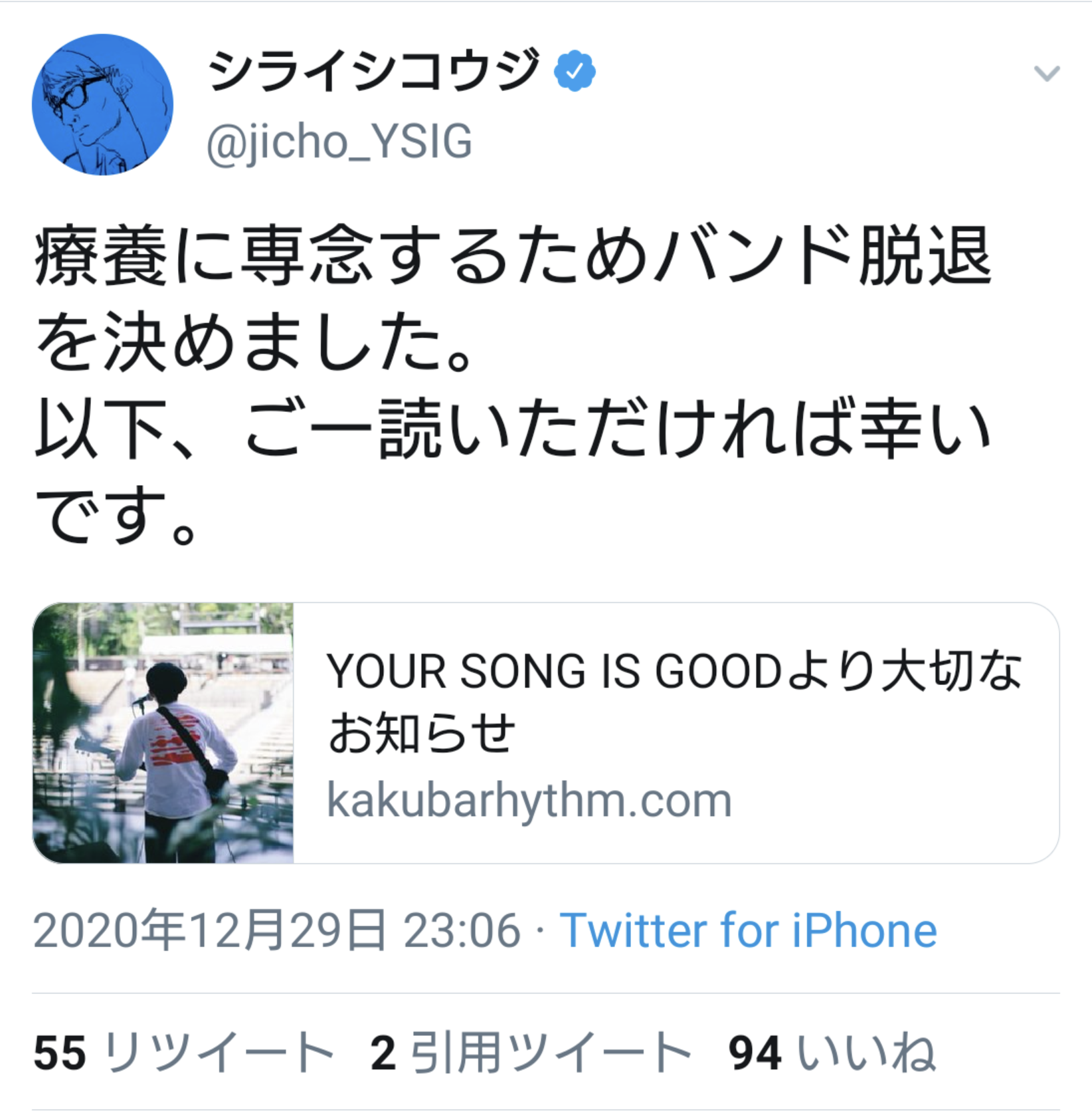 「YOUR SONG IS GOOD」シライコウジさん、療養に専念するためバンドを脱退・・・