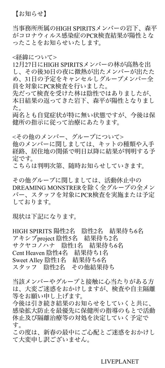 検査時は無症状でしたが、暫くは医師と保健所の指示に従いながら体調の治療回復に専念致します。