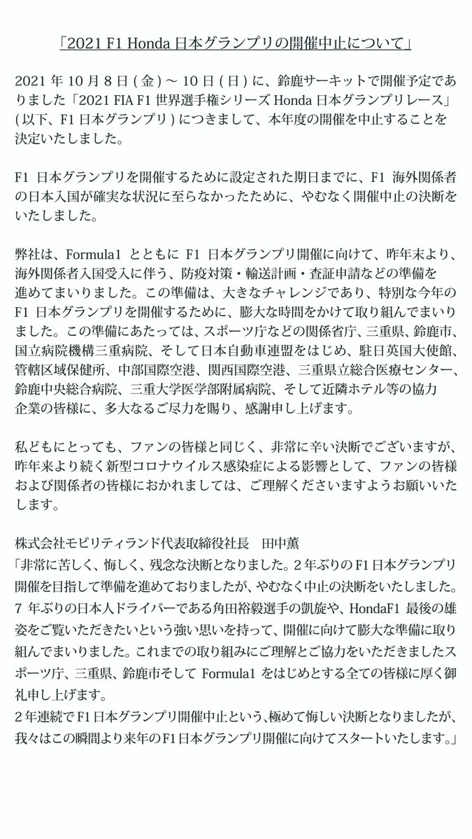 【正式発表】「F1日本グランプリ」本年度の開催を中止…
