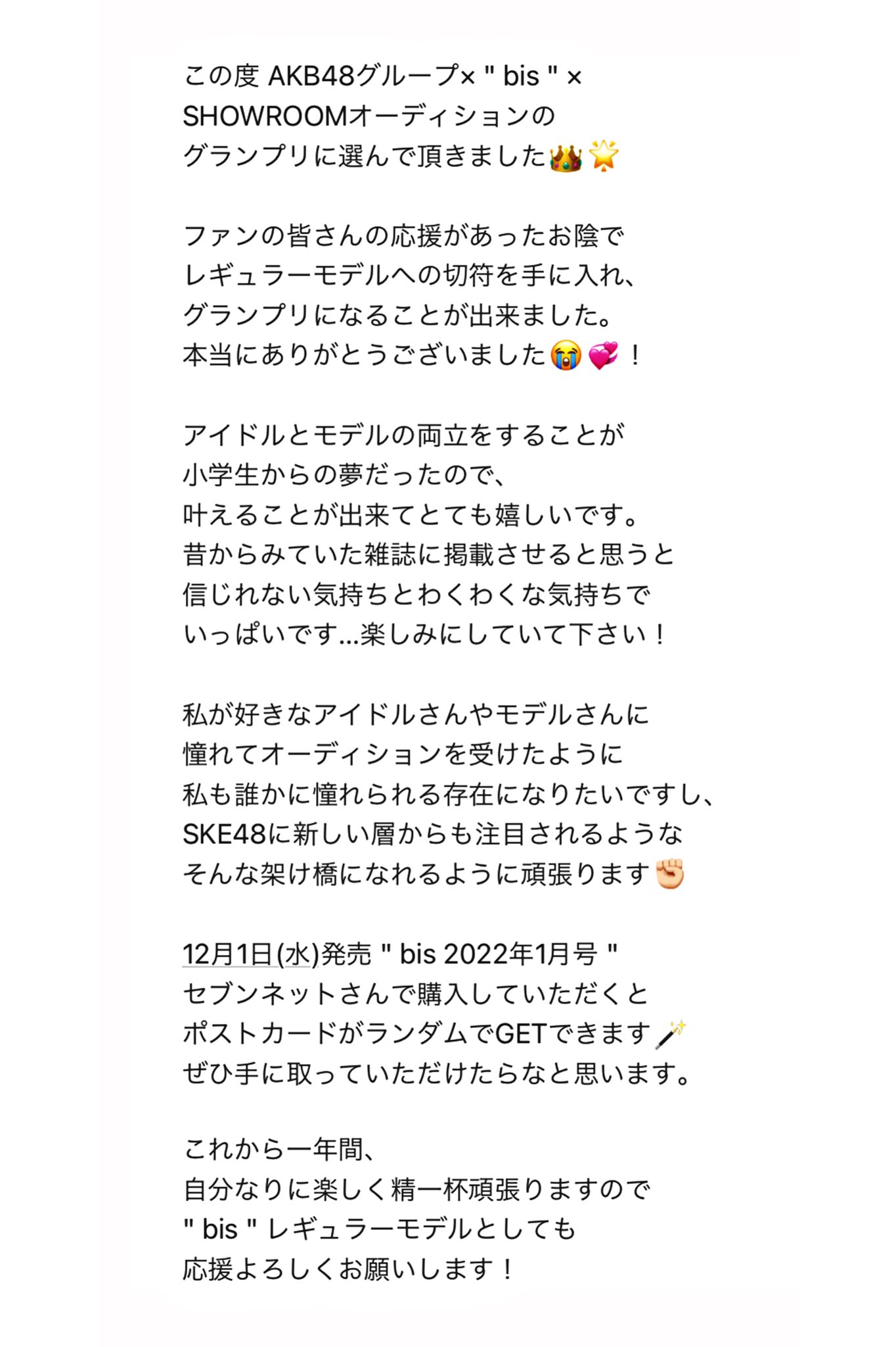 「(1年間のレギュラーモデルに決まって)すごく信じられなくて震えが止まらなかったです。ずっとアイドルとモデルの両立をすることが夢だったので、かなえることができて本当にうれしいし幸せです! 読者の皆さんに興味を持ってもらえるような、憧れてもらえるようなモデルさんを目指します。bisでは、”いろんなジャンルの可愛い”に挑戦したいです! 普段の自分とは違う、新しい自分を楽しみたいです」