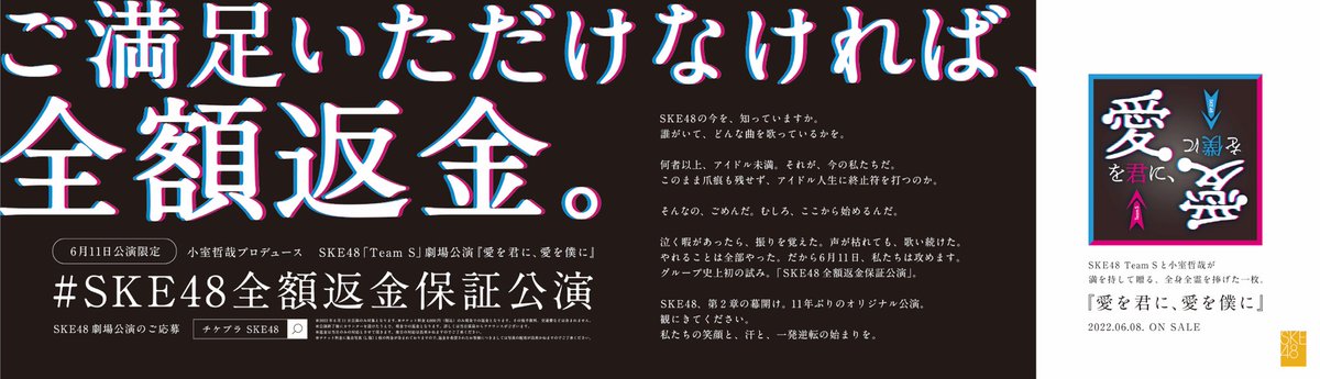 #SKE48 の #全額返金保証公演 GOで企画させていただきました。各所で話題になっていますが、メンバーの熱量と覚悟をストレートにアクションにした企画です。急成長中の小林がクリエイティブディレクターを、SKE48に思い入れの深い小堀がビジネスプロデューサーを務めました。公演、すごいので、ぜひ。