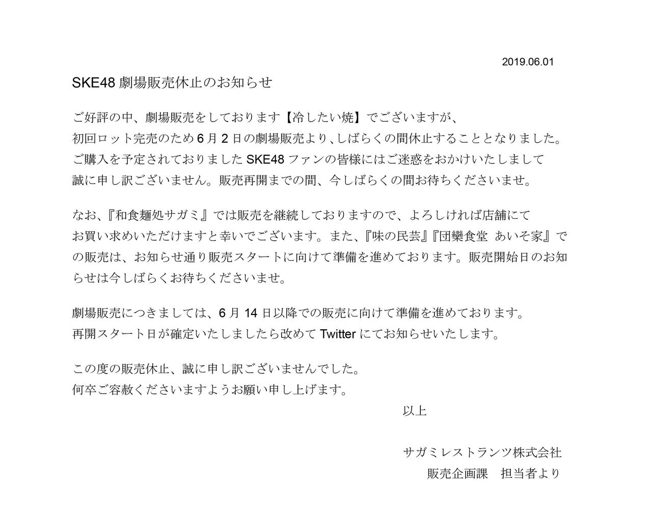 【#冷やしたい焼き 】SKE48劇場販売休止のお知らせ