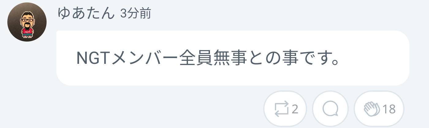 【有能】SKE湯浅支配人「NGTメンバー全員無事とのことです」