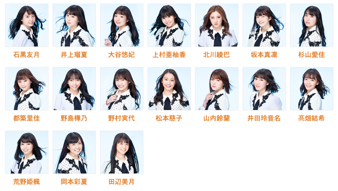 石黒友月・井上瑠夏・大谷悠妃・上村亜柚香・北川綾巴・坂本真凛・杉山愛佳・都築里佳・野島樺乃・野村実代・松本慈子・山内鈴蘭・井田玲音名・髙畑結希・荒野姫楓・岡本彩夏・田辺美月