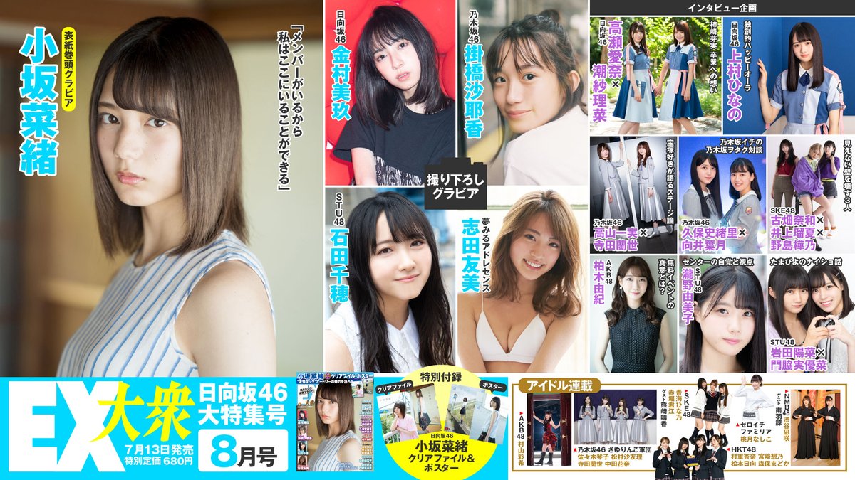 今週土曜日13日は日向坂46小坂菜緒さん表紙巻頭グラビアのEX大衆8月号の発売日です。表紙ができましたので、こちらでも公開。小坂さんには本誌初登場で、表紙を務めていただきました。クリアファイル&ポスター付録に、ロングインタビューも。詳しい内容紹介は下記でどうぞ!https://t.co/iuoDfhq3RR pic.twitter.com/zDv4Hx3JG8