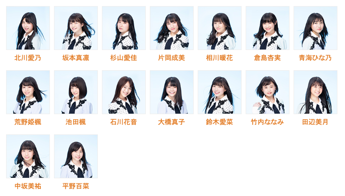 北川愛乃・坂本真凛・杉山愛佳・片岡成美・相川暖花・倉島杏実・青海ひな乃・荒野姫楓・池田楓・石川花音・大橋真子・鈴木愛菜・竹内ななみ・田辺美月・中坂美祐・平野百菜【チケット料金】