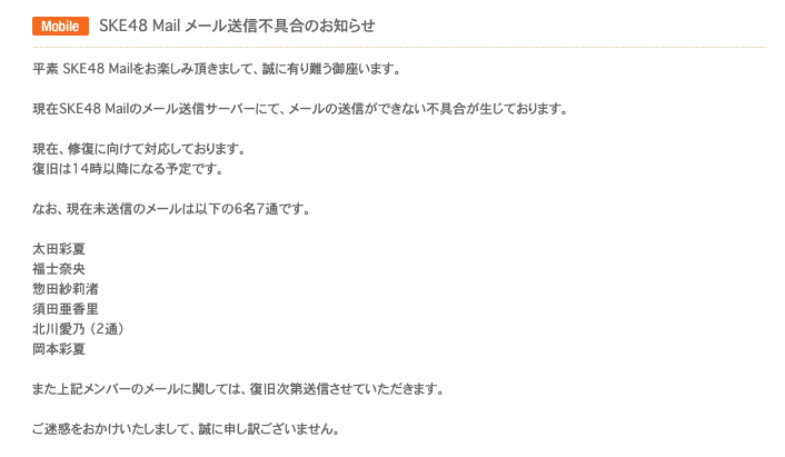 SKE48 Mailのメール送信サーバーにてメールの送信ができない不具合「復旧は14時以降になる予定」