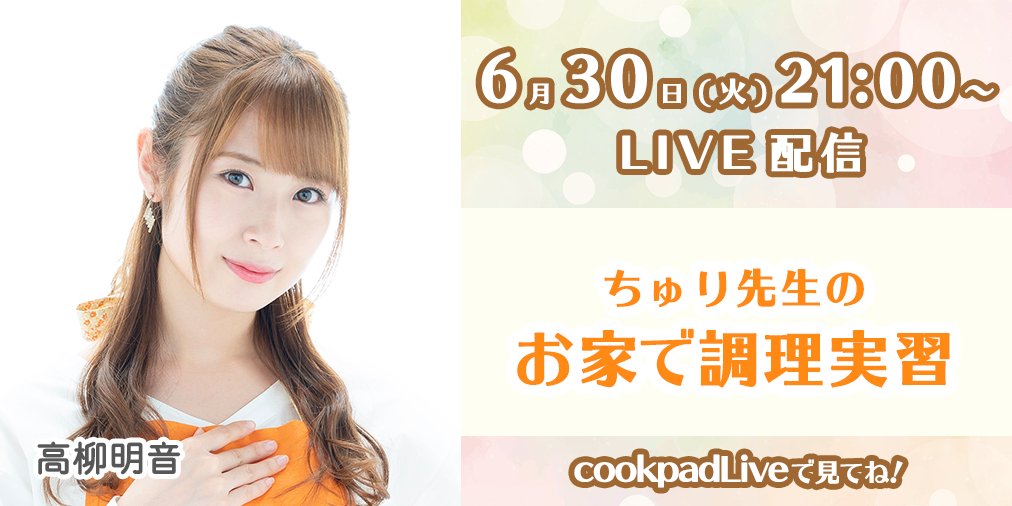 【配信日決定】6/30(火)21:00?高柳明音の「ちゅり先生のお家で調理実習」をLive配信