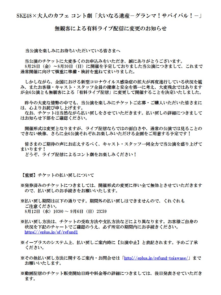 【重要なお知らせ】『SKE48x大人のカフェ』 特別コント公演が『有料ライブ配信』に変更