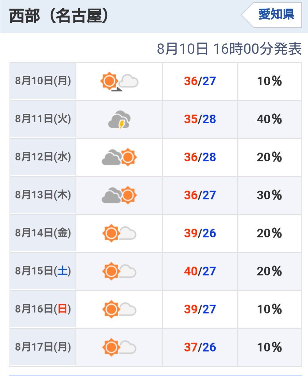 名古屋の予想最高気温40℃て..