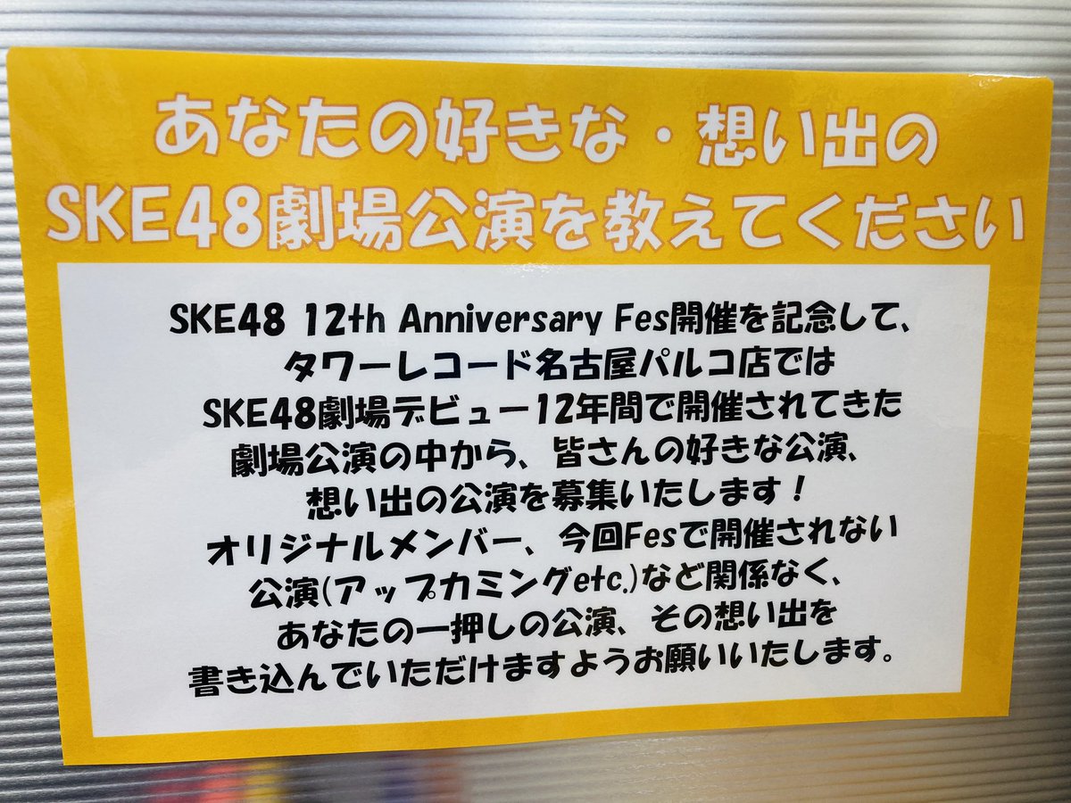 10/3.4.5に開催が決定したSKE48 12th Anniversary Fesを記念して、地元・栄のタワーレコード名古屋パルコ店では、Fesを店頭からも盛り上げるべく12年間の中での『あなたの好きな・思い出の公演』を募集致します!