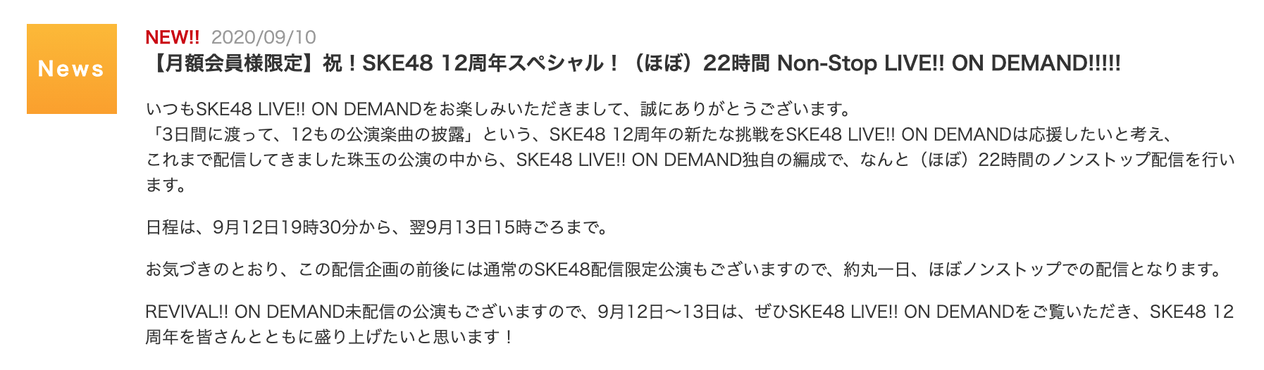 SKE48 LIVE!! ON DEMANDでは、9月12日17時からのSKE48配信限定公演 研究生「青春ガールズ」公演、そして9月13日 SKE48配信限定公演 チームE「SKEフェスティバル」公演の間、過去の公演映像をほぼノンストップでお送りいたします。